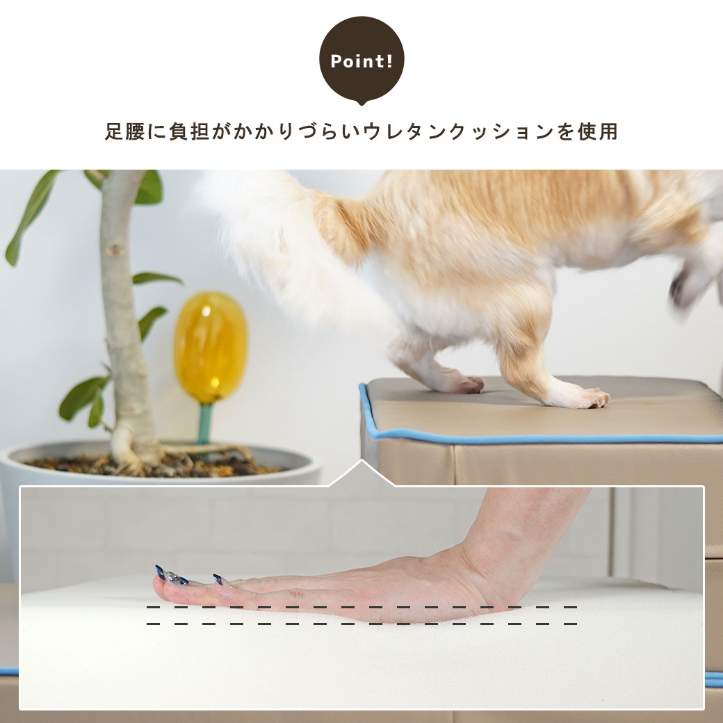 シニア期のペットや身体が形成されている途中のパピーはもちろん、足腰の弱いわんちゃん、足の短い犬種にもおすすめしたい優しい設計のペット用昇降ステップです。