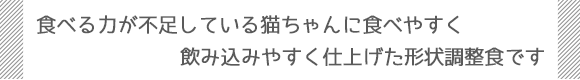 噛む、飲む等「食べるちから」が不足している猫ちゃんに、より食べやすく飲み込みやすく仕上げ、且つ栄養バランスを考えた猫用(形状調整食)です。