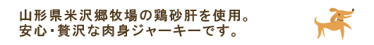 米沢郷牧場の開放鶏舎(平飼い)で、抗生物質を一切与えず育てた「無薬飼育鶏」の砂肝のみで作りました。丁寧な下処理のあと、じっくり水分を抜いています。普段与えているジャーキーと比較してみてください。ワンちゃんはきっと「天然の贅沢な旨味」がわかるはずです。