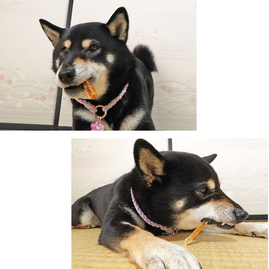 柴犬9.0kg(首36/胴52/丈43cm)のざくろちゃんが試食