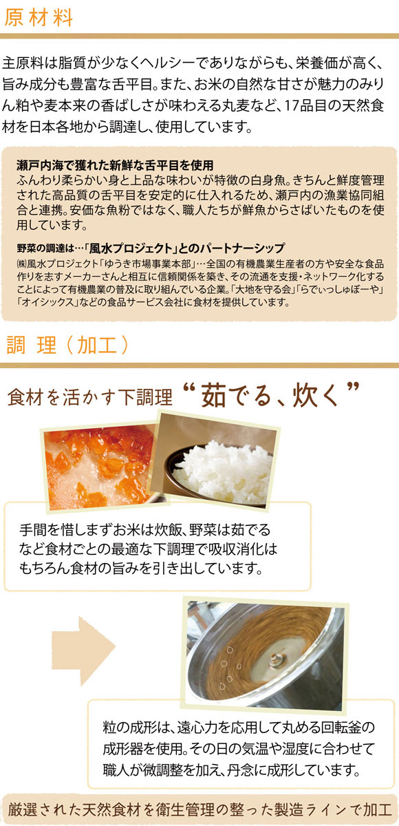 - 白身魚(瀬戸内海産)、丸麦(国産)、みりん粕(愛知県産)、玄米(山形県産・他)、ビール酵母(国産)、カツオ節(国産)、牛オイル(国産)、食用牛骨カルシウム(国産)、牛エキス(国産)、豆腐おから(埼玉県神泉村産)、鶏肝臓(広島県産)、カツオエキス(静岡県焼津市産)、米油(国産)、さつま芋(国産)、にんじん(千葉県産・他)、昆布(北海道産・他)、ビタミン・ミネラル類(栄養添加物は総量の 1.5%以内)※塩化カリウム、グルコン酸亜鉛、ピロリン酸第二鉄、ビタミン E、ビタミン B12,グルコン酸銅、ビタミン A、パントテン酸カルシウム、ビタミン D、ビタミン B2