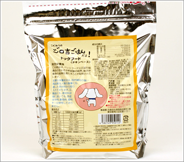 原材料玄米(国産・減農薬米)、鶏の胸肉(国産)、ポークエキス(国産)、鶏レバー(国産)、ポークオイル(国産)、乾燥おから(国産大豆・遺伝子組換無し)、かつお節(国産)、食用牛骨カルシウム(国産)、魚粉(国産)、にんじん(千葉県産・他・減農薬)、かつおエキス(国産)、昆布(北海道産)、ビタミン・ミネラル類:塩化カリウム、グルコン酸亜鉛、ビタミンE、ピロリン酸第二鉄、グルコン酸銅、パントテン酸カルシウム、ビタミンD、葉酸