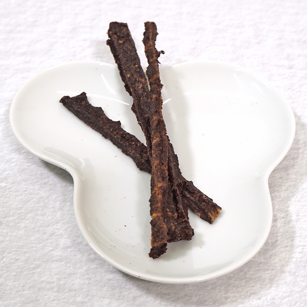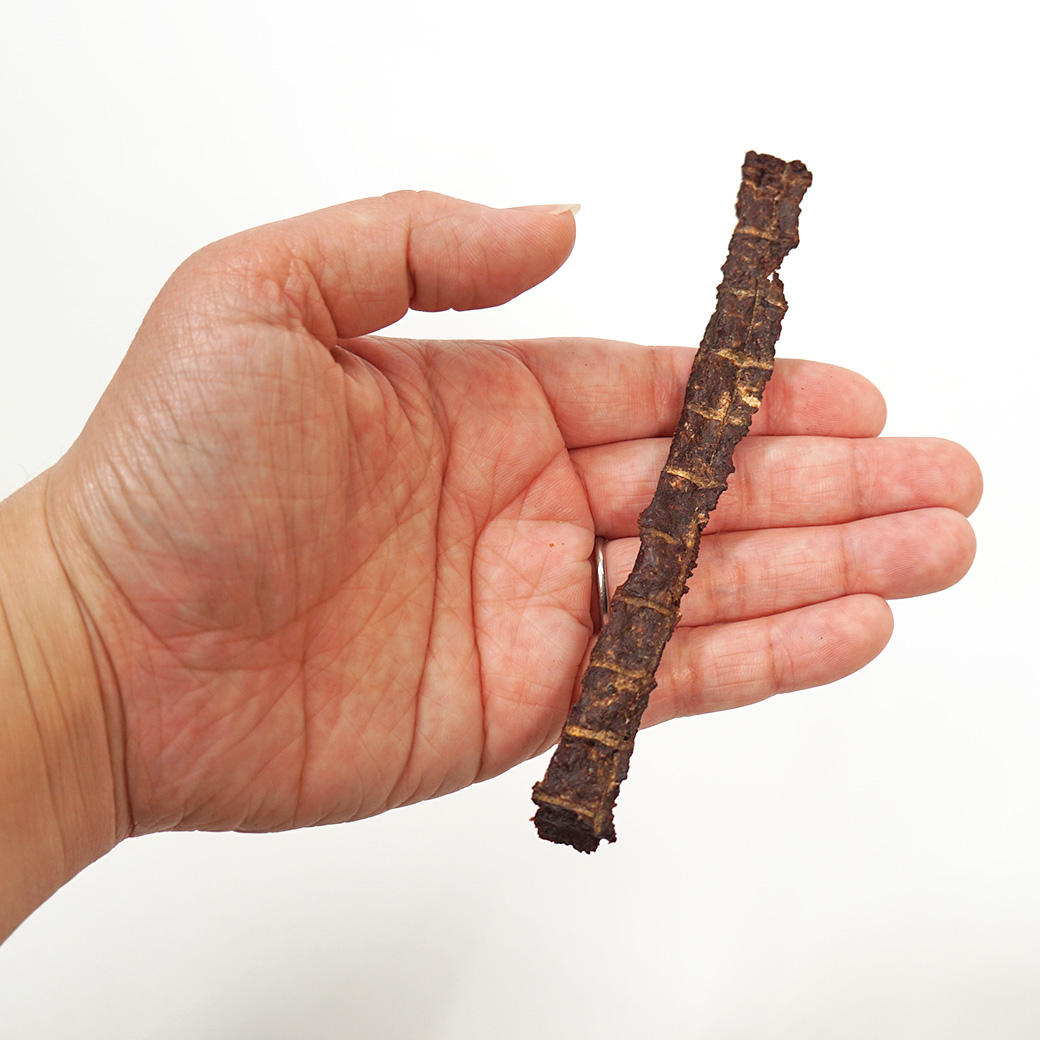 長さ10センチ前後、太さ1センチ弱の、スティックタイプのジャーキーです。 鹿肉をミンチにしてからから細長く乾燥させてあるので、小さなワンちゃんでも食べやすいです。