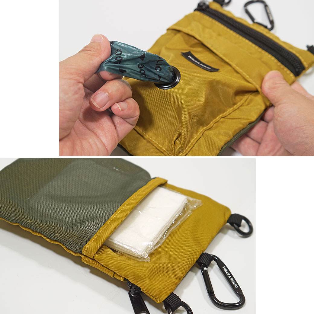 スマートフォンやカメラのバッテリーなどが収納できてお散歩やおでかけに大活躍です。うんち袋はウェットティシュで手足をふいたりお顔をふいたりするのでごみ袋としても使えてとても便利です。