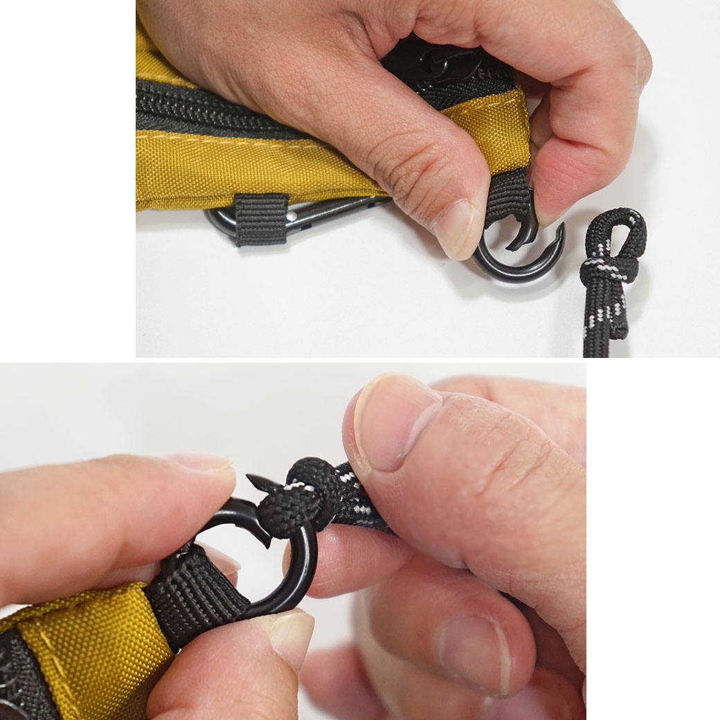 パラコードは丸管ごとサッと取り外せます。カラビナでバッグやリードに取り付けるときは