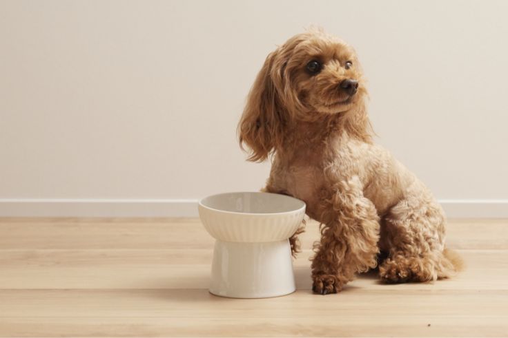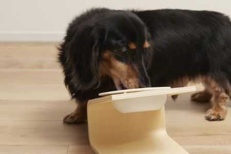 下をむいている姿勢が食べづらそうに感じる、お鼻の短い種類の為、床に置いたお皿からだと首の角度が急になりがちでむせることが多い、四肢のふんばりがきかず滑ってしまう、首を下に向ける姿勢がしづらくなっている