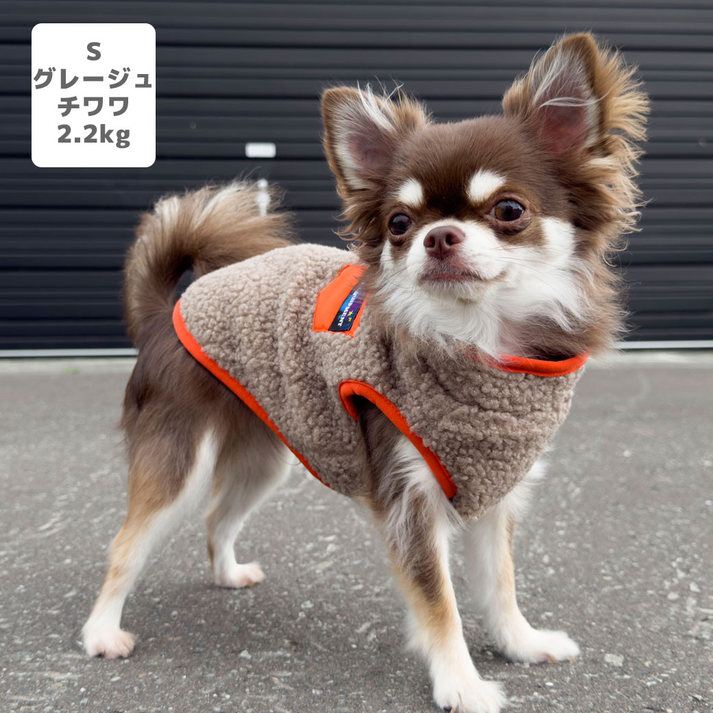 チワワ2.2kg(首18.5/胴30/丈30cm)のピクルスくんはグレージュのSを着用