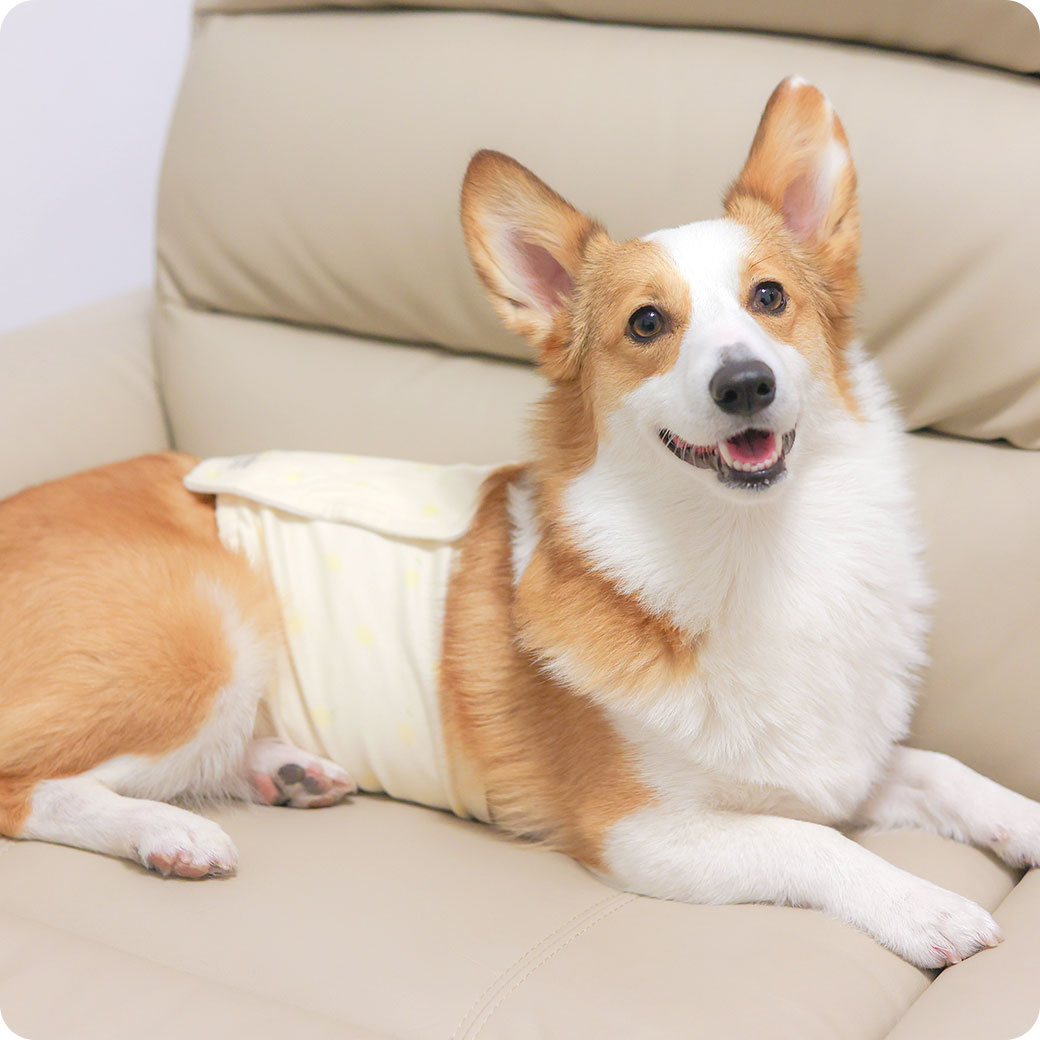 コーギー10.6kg(首36/胴51/丈37cm)のラテちゃんはレモンのXLを着用