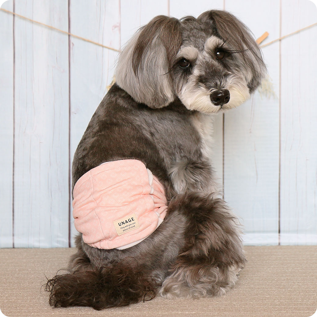 ミニチュアシュナウザー4.8kg(首22/胴39/丈29cm)のあろあちゃんはUNAGEサーモンのMを着用
