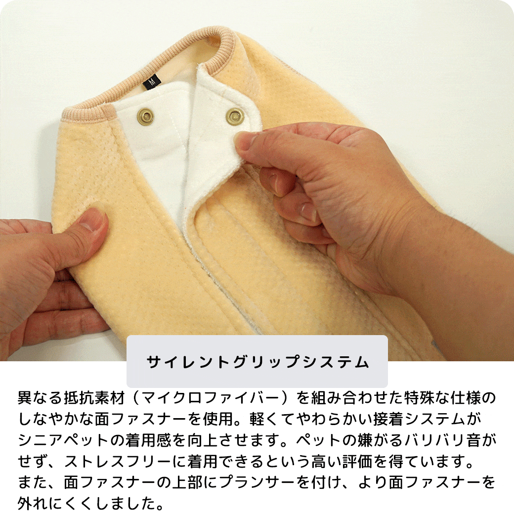 異なる抵抗素材(マイクロファイバー)を組み合わせた特殊な仕様のしなやかな面ファスナーを使用。軽くてやわらかい接着システムがシニアペットの着用感を向上させます。ペットの嫌がるバリバリ音がせず、ストレスフリーに着用できるという高い評価を得ています。