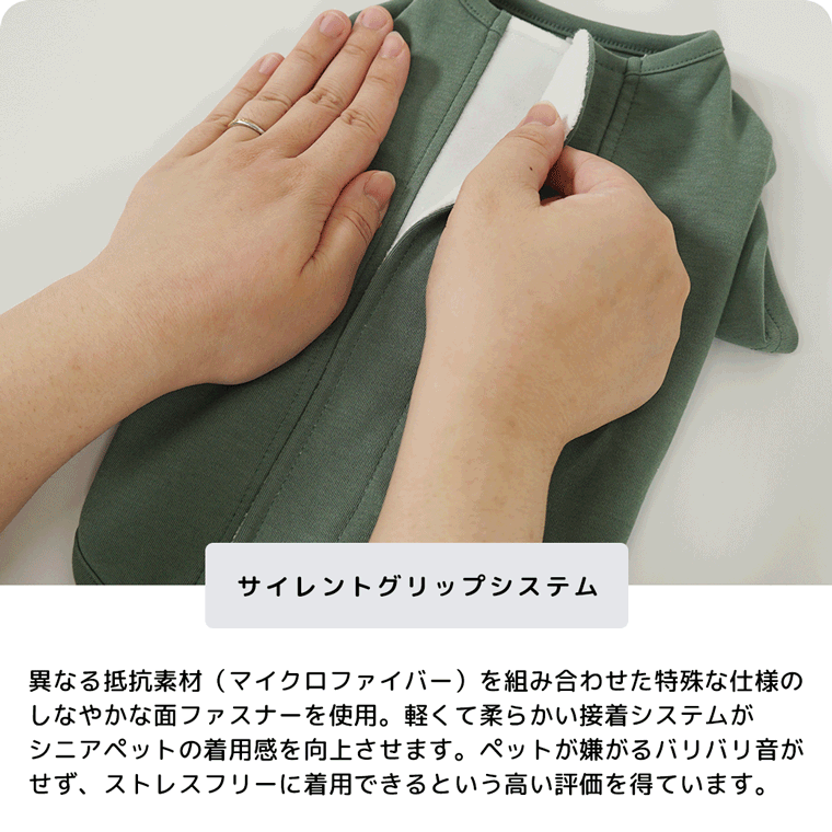 異なる抵抗素材(マイクロファイバー)を組み合わせた特殊な仕様のしなやかな面ファスナーを使用。軽くてやわらかい接着システムがシニアペットの着用感を向上させます、ペットの嫌がるバリバリ音がせず、ストレスフリーに着用できるという高い評価を得ています。