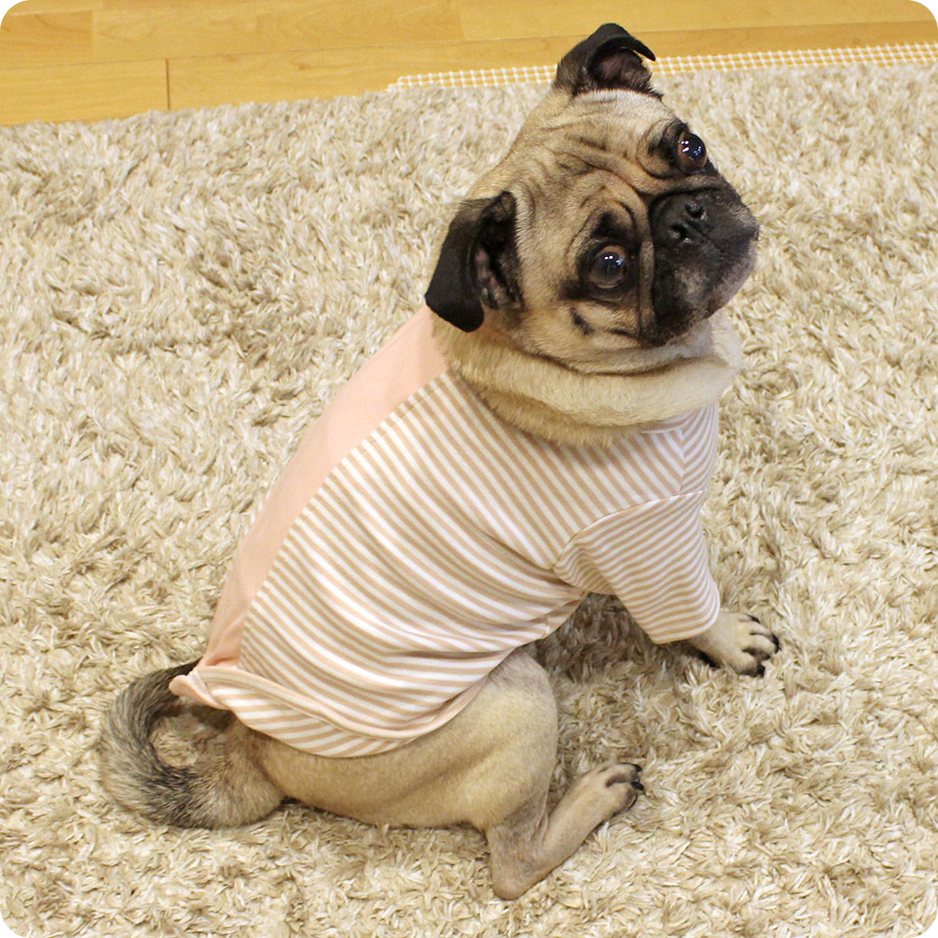 パグ9.4kg(首36/胴53/丈31cm)のめいちゃんはボーダーピンクベージュのFを着用