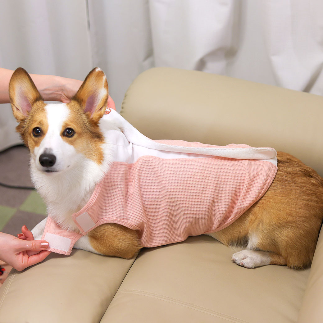 コーギー10.6kg(首36/胴51/丈37cm)のラテちゃんはピンクのXXLを着用