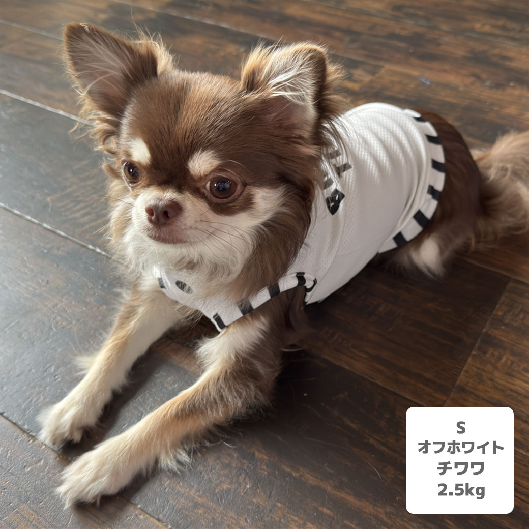 チワワ2.2kg(首18.5/胴30/丈30cm)のピクルスくんはオフホワイトのSを着用
