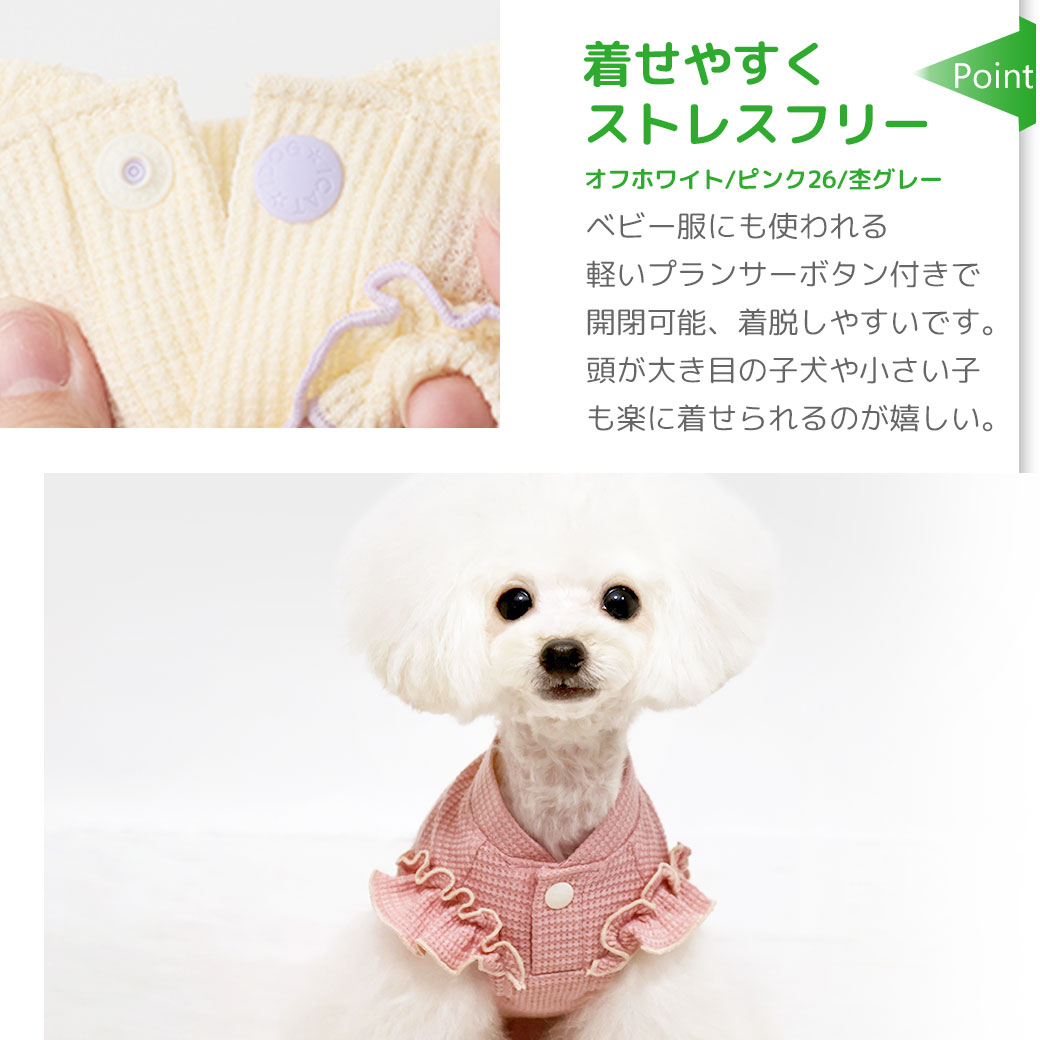 オフホワイト/ピンク26/杢グレーの前は、ベビー服にも使われる軽いプランサーボタン付きで開閉可能、着脱しやすいです。頭が大き目の子犬や小さい子も楽に着せられるのが嬉しい。