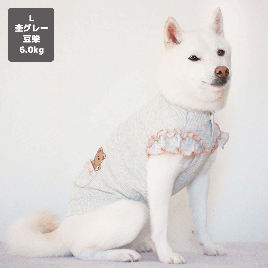 豆柴6.0kg(首31/胴45/丈33cm)のラテちゃんは杢グレーのLを着用
