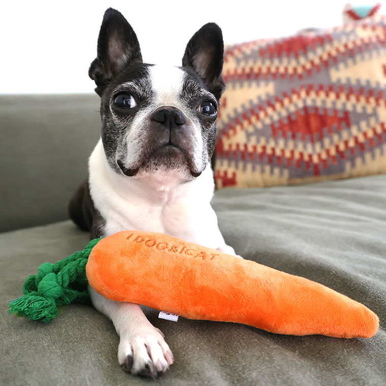 にんじんモチーフの布製の犬用・猫用のおもちゃです。 「IDOG&ICAT」の刺繍入り。 ヘタ部分はロープになっており、カミカミしたり引っ張り合いっこができます。