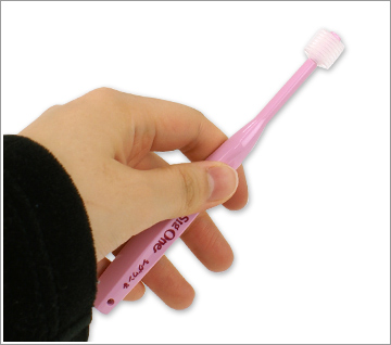 360°型なので、どこからでも磨け、従来の歯ブラシのように毛の裏面のプラスティック部分が、歯や歯ぐきにカチカチ当たることがなくて安心。