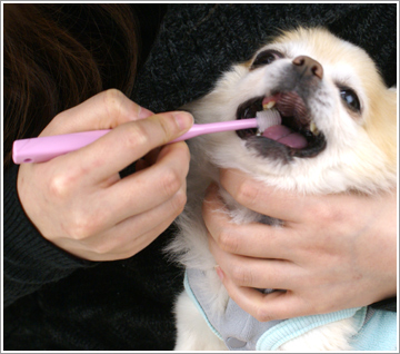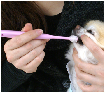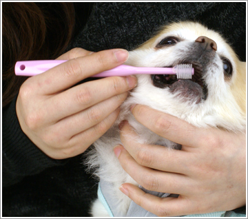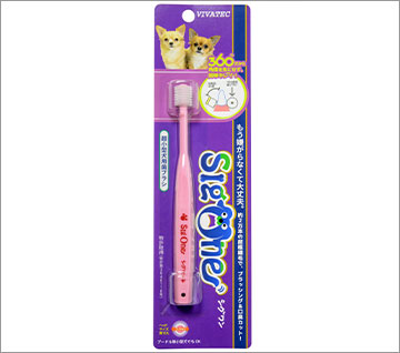 360°型なので、どこからでも磨け、従来の歯ブラシのようにプラスティック部分が歯や歯ぐきにカチカチ当たることが気になるワンちゃんも安心です。