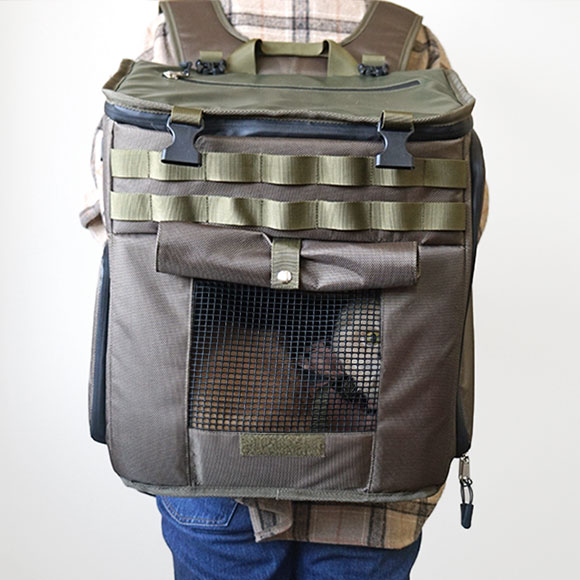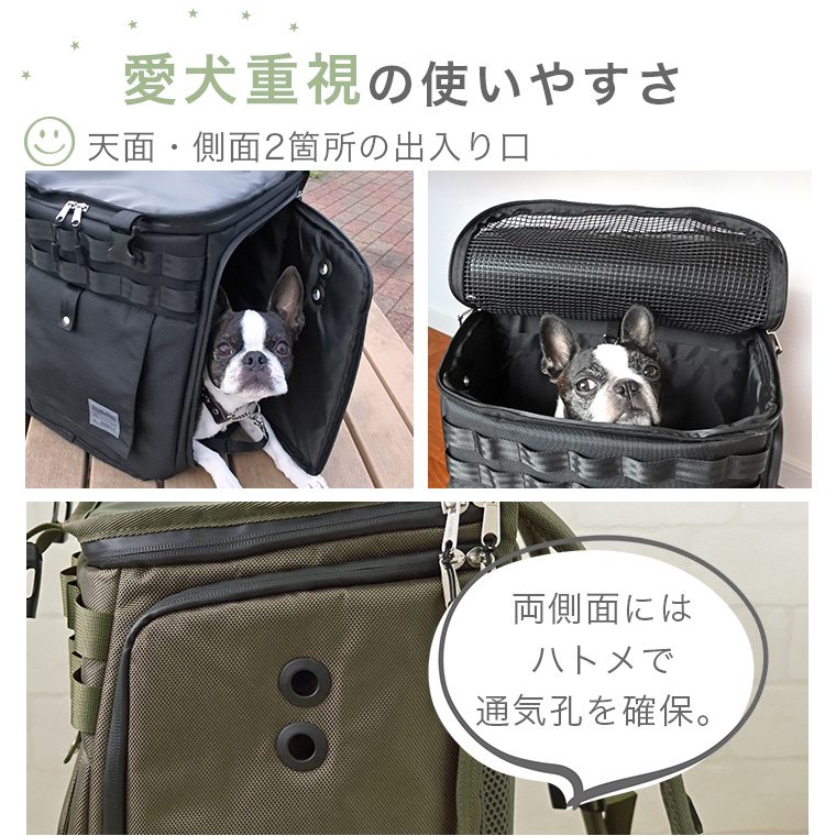 天面と側面の2箇所に入口があるので出入りしやすいです。 天面にはメッシュのカバー、バッグ正面はメッシュの小窓になっており 中に入っているペットからもオーナー様や外が見えて安心です。