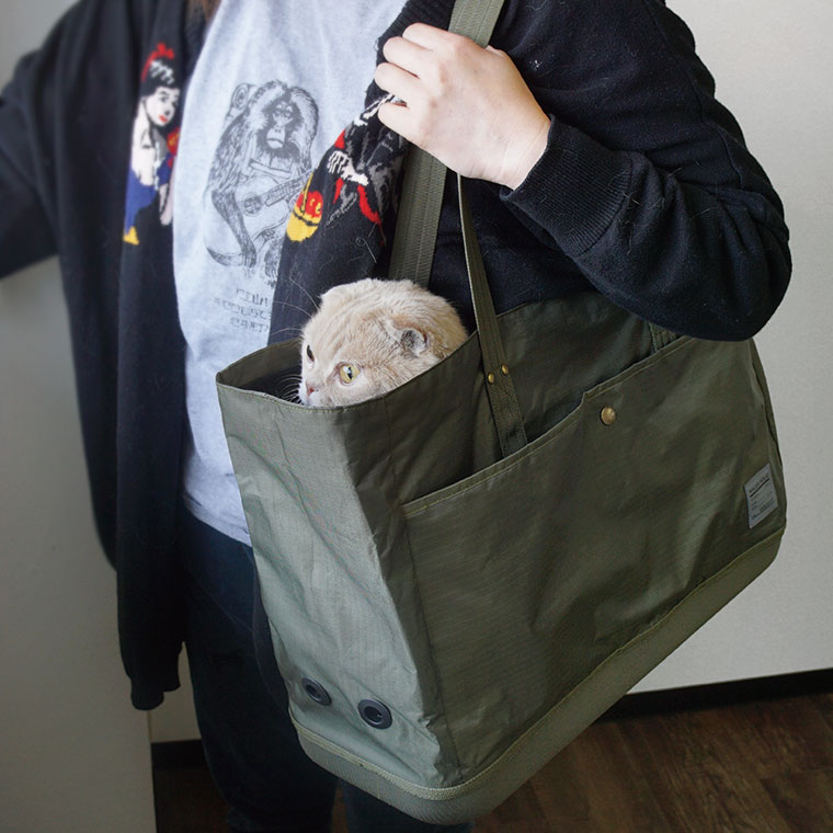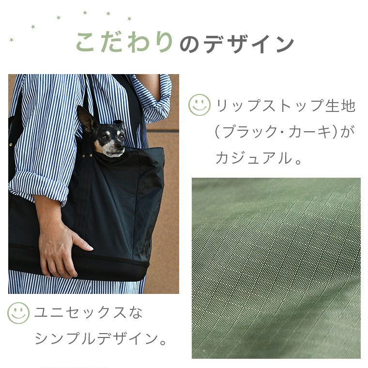 リップストップ生地でカジュアルに仕上げました。 底面のみセミハード素材を使用し、安定感と安全性を高めました。 ビート板のような固さと肌触りの底面でペットをしっかりと守ります。 両側面には直径約2cmの空気穴が空いています。