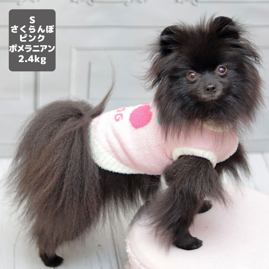 ポメラニアン2.4kg(首19/胴30/丈26cm)のはちみつちゃんはさくらんぼピンクのSを着用