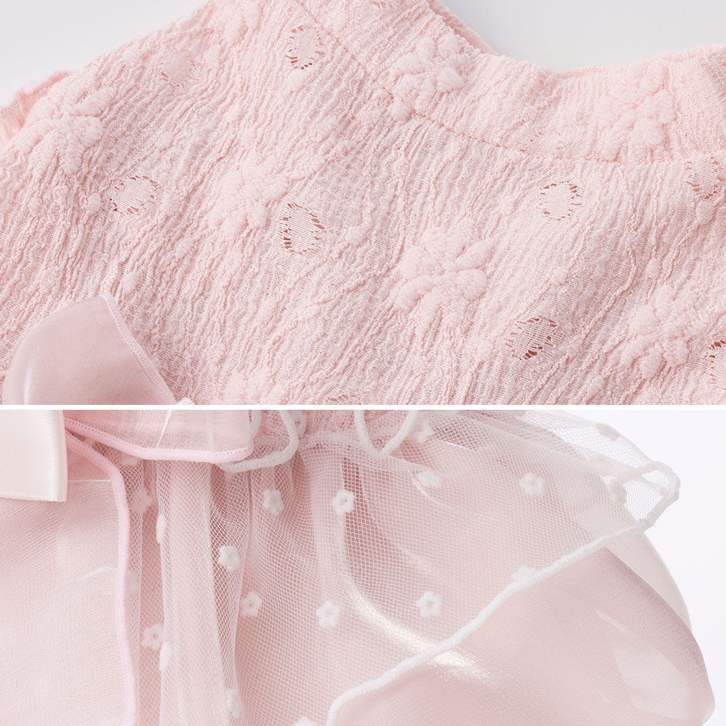 身頃は花柄のレース素材で、お花部分は立体的でふんわりとした表情に仕上げました。