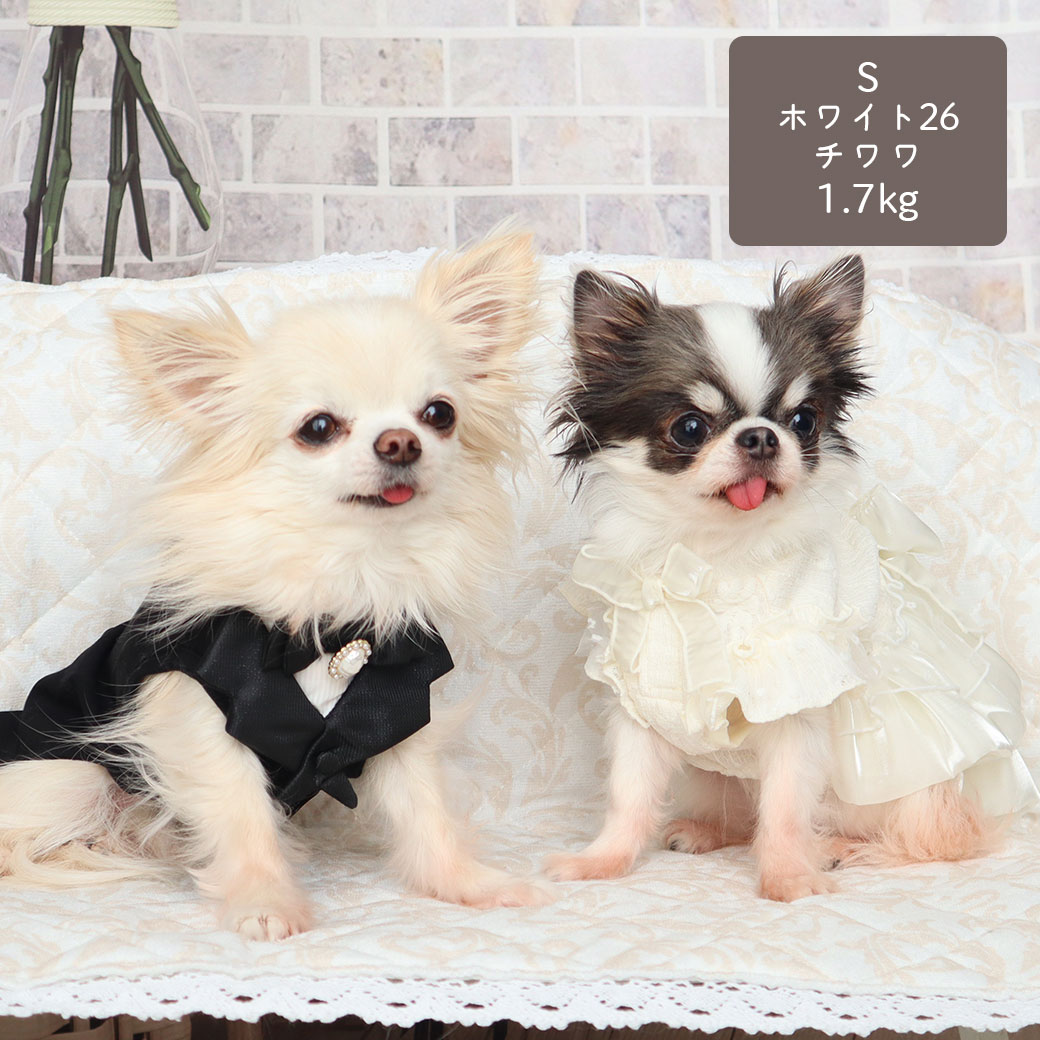 チワワ1.7kg(首19/胴28.5/丈21cm)の小桃ちゃんはホワイト26のSを着用