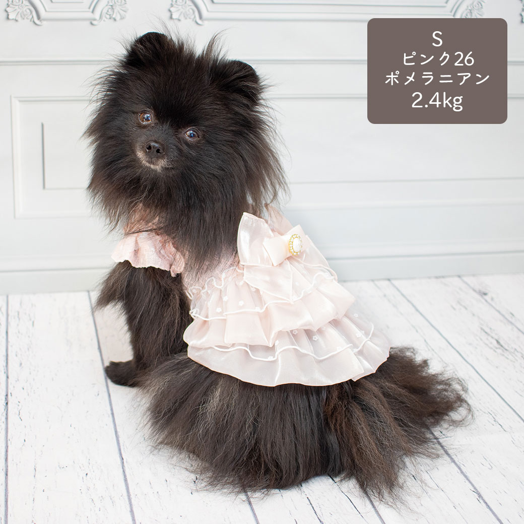 ポメラニアン2.4kg(首19/胴30/丈26cm)のはちみつちゃんはピンク26のSを着用