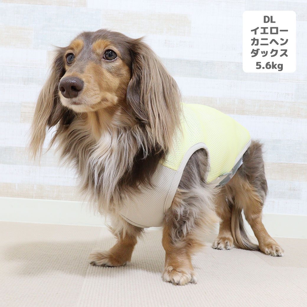 カニヘンダックス5.6kg(首35/胴43/丈37cm)のハクくんはイエローのDLを着用