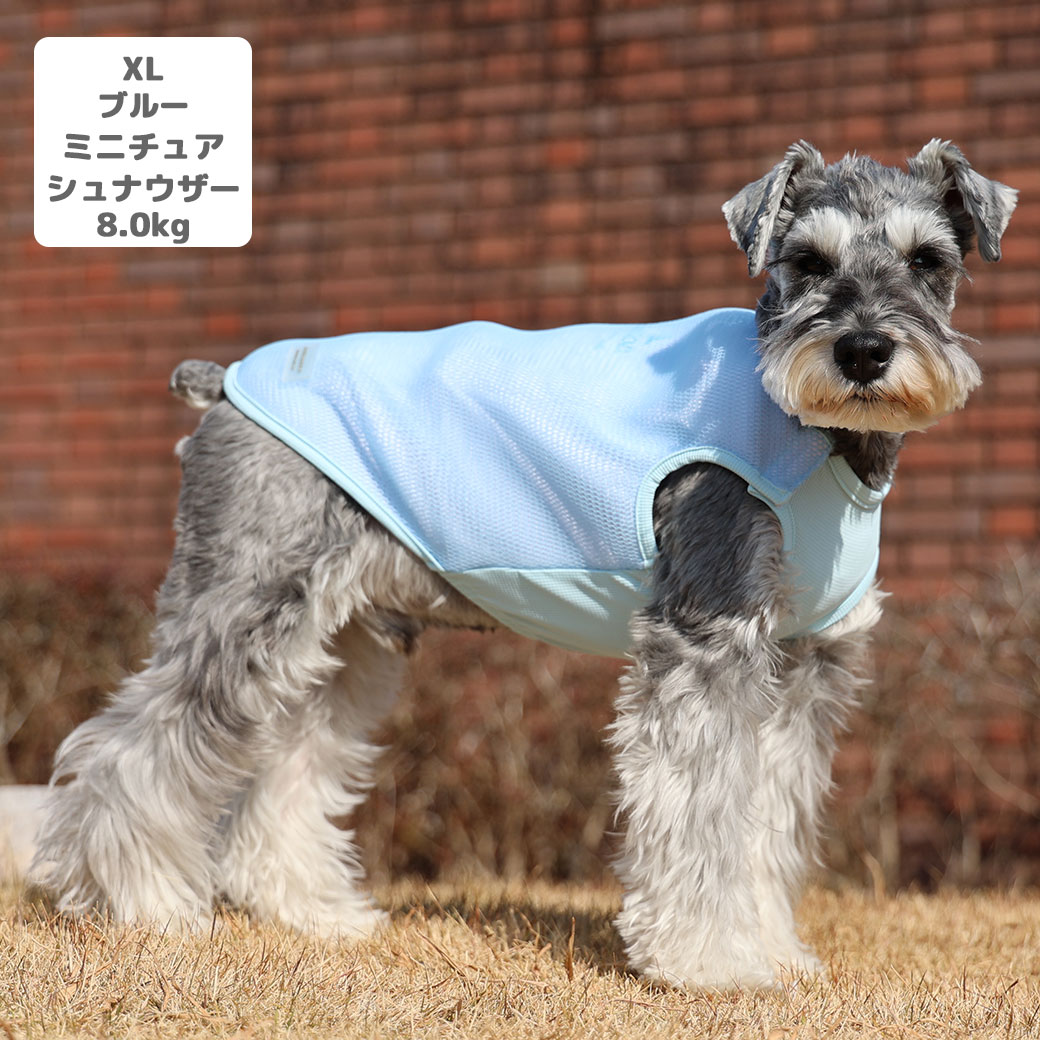ミニチュアシュナウザー8.0kg(首30/胴48/丈37cm)のマハロくんはブルーのXLを着用