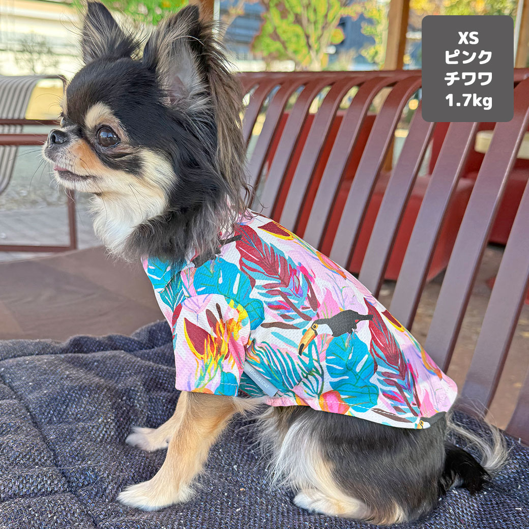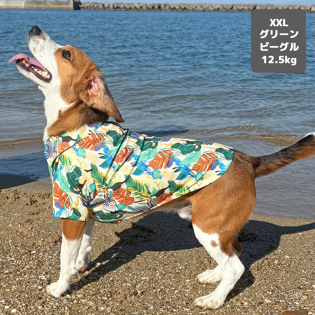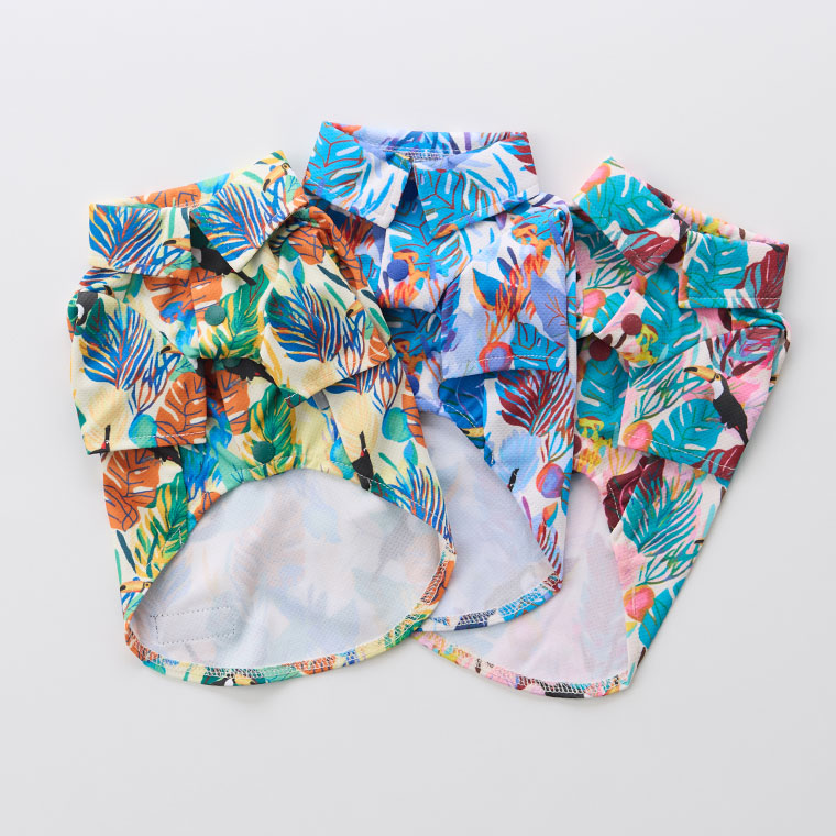 南国の雰囲気たっぷりのカラフルなボタニカル柄とオオハシが描かれた鮮やかなトロピカル柄で、写真映えもばっちり。愛犬もリゾート気分に。