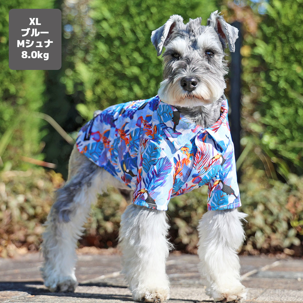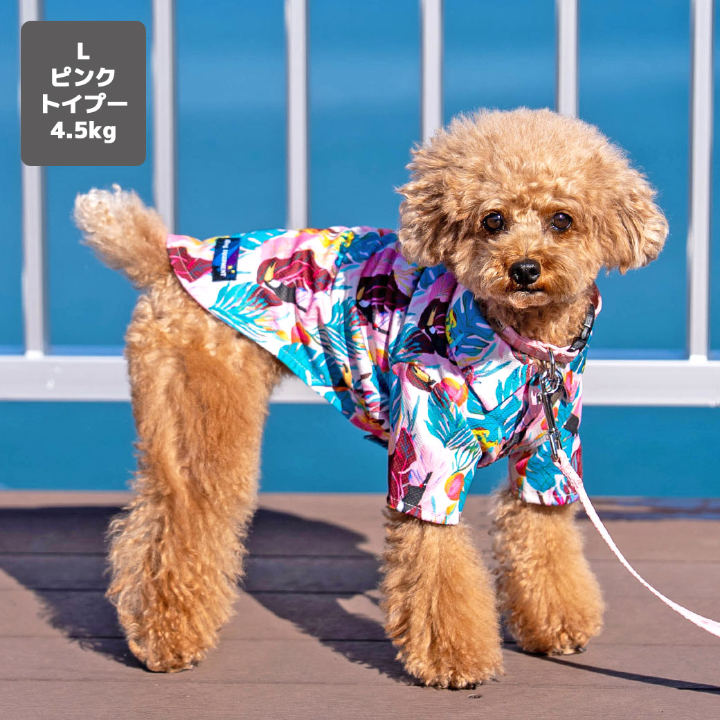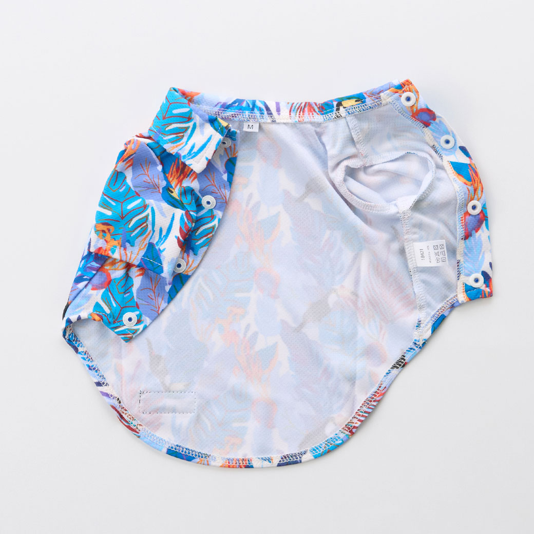 iDogオリジナルのカラフルなトロピカル柄が目を引く犬用アロハシャツです。