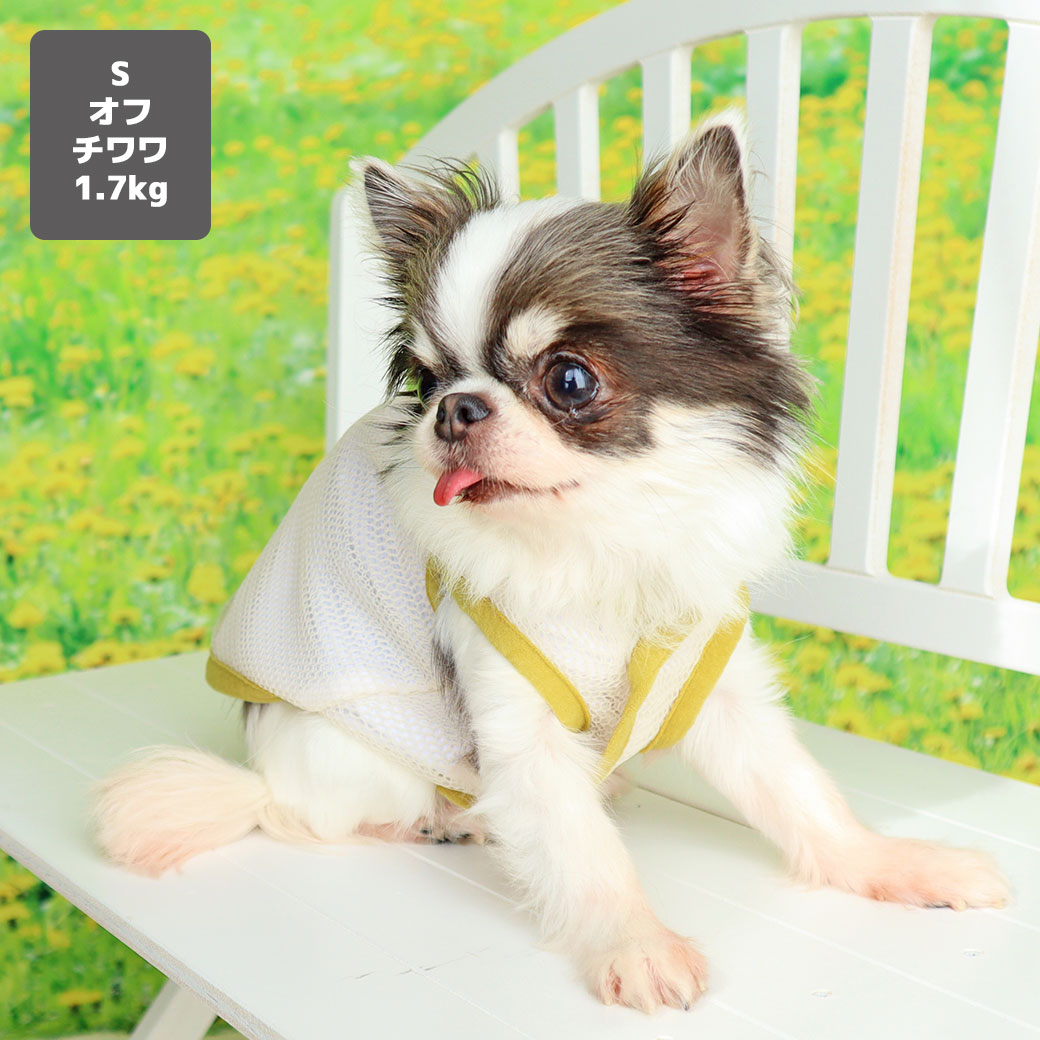 チワワ1.7kg(首18/胴27.5/丈18cm)の小真知ちゃんはオフのSを着用