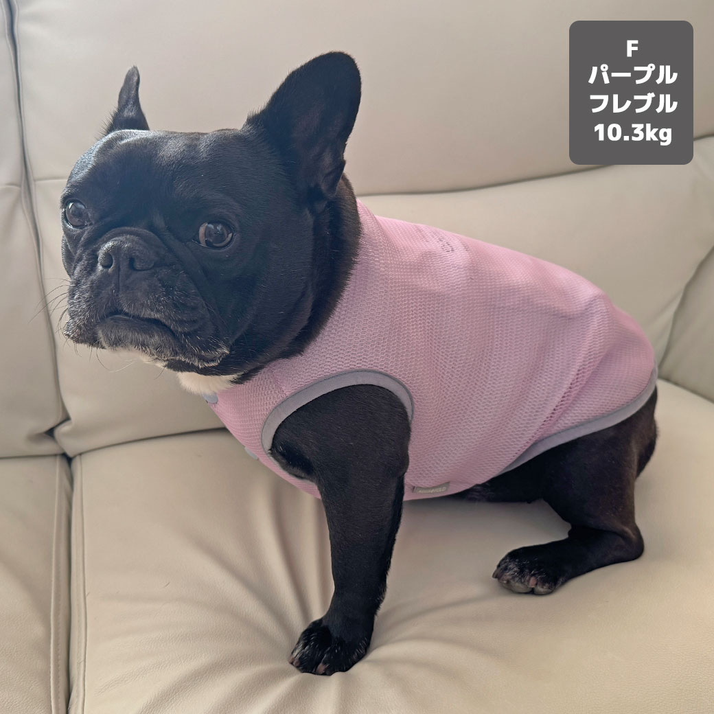 フレブル10.3kg(首38/胴56/丈34cm)のPêcheちゃんはパープルのFを着用