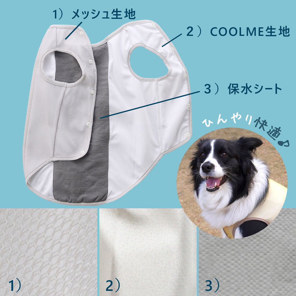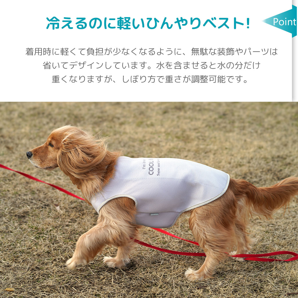 タンクトップの背中部分が濡らすととてもひんやりして気持ちよさそうです。また時間がたってもひんやりが続くので夏のお散歩で大活躍です。 メッシュになっていて通気性も良く、背中のプリントもかわいいです!