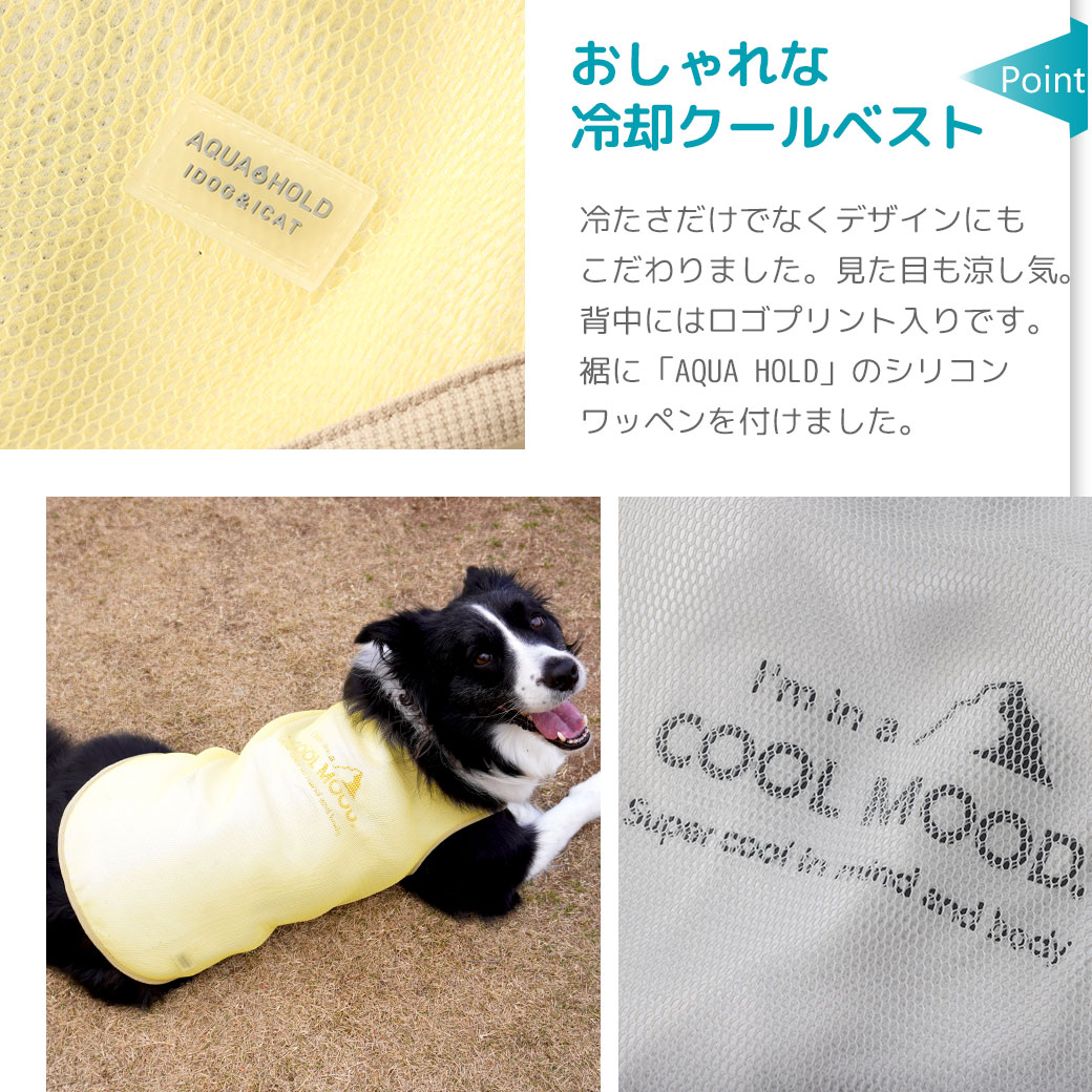 暑い日の外遊びにピッタリの犬用冷却クールベストです。 保水生地と空冷機能でひんやり心地よく冷却し続けます。お出かけ前に水を含ませてご利用下さい。 特許取得構造を利用したひんやり「冷却」タンク「AQUA HOLD PREMIUM」で新感覚のひんやり感を実感してください 。