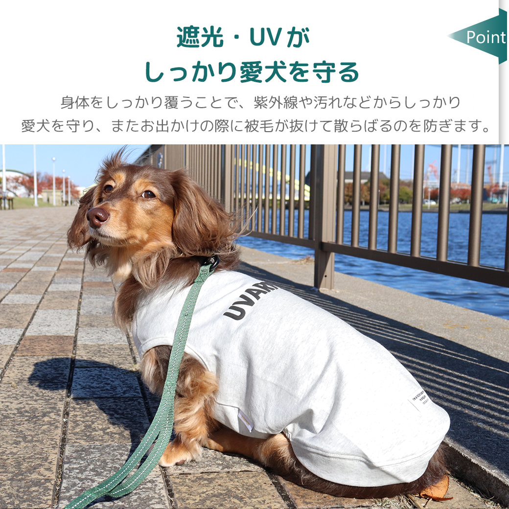 夏の暑さや紫外線から愛犬を守ってくれる、5つの機能(遮熱・UVカット・冷感・抗菌・マイナスイオン)を持った素材を使用したタンクトップです。