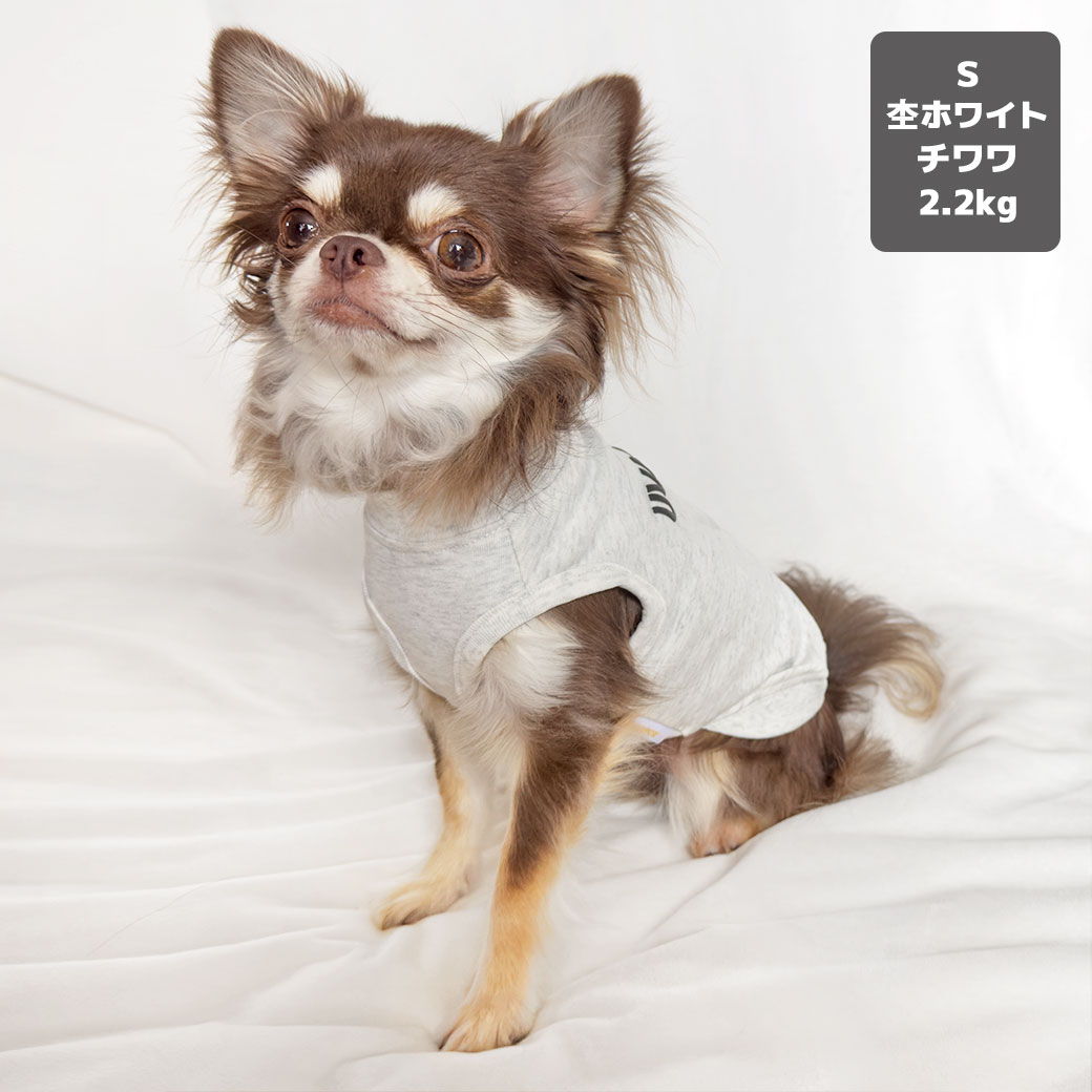 チワワ2.2kg(首18.5/胴30/丈30cm)のピクルスくんは杢ホワイトのSを着用