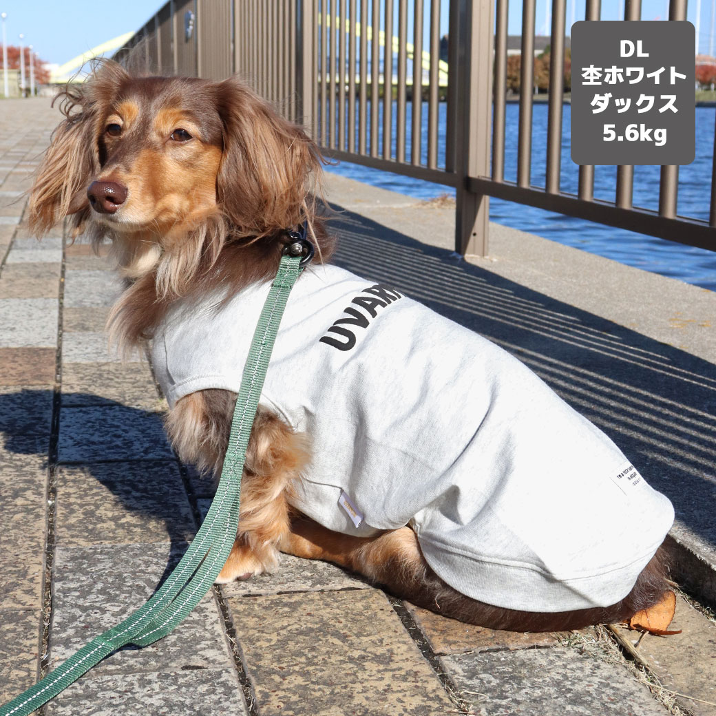 カニヘンダックス5.6kg(首35/胴43/丈37cm)のハクくんは杢ホワイトのDLを着用