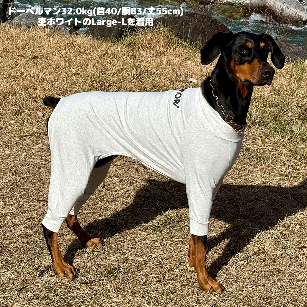 ドーベルマン32.0kg(首40/胴83/丈55cm)のクララちゃんは杢ホワイトのLarge-Lを着用
