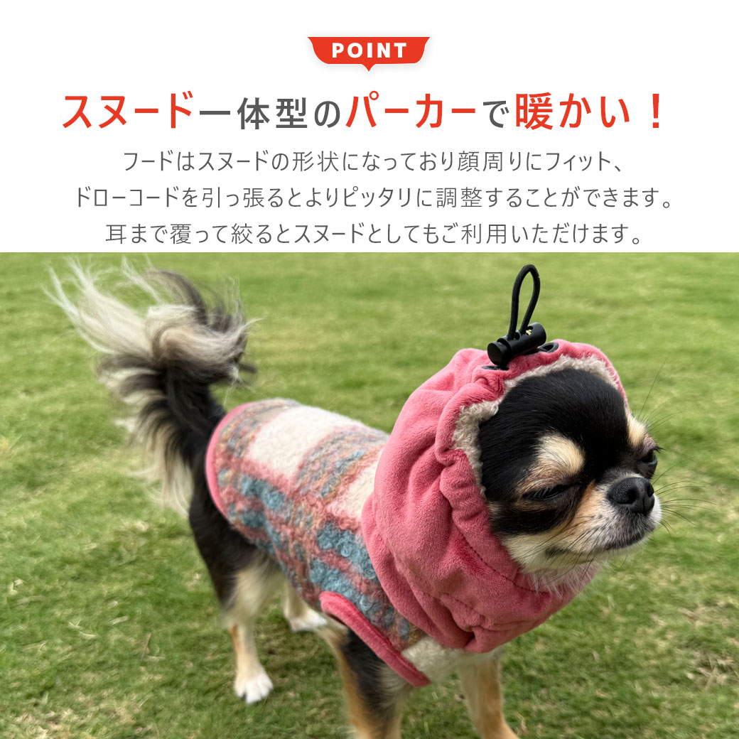 厚みのあるしっかりとした素材のあったか〜い愛犬用パーカー。スヌード一体型で顔周りまでしっかりガードします。