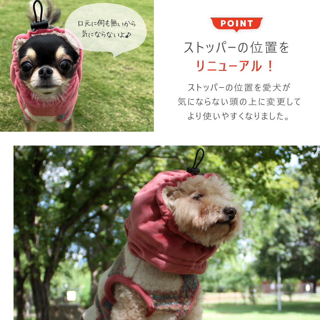 着せるだけで首まですっぽりと覆って暖かいです。顔周りに合わせてコードを絞れば風が通らずさらに暖かく過ごせます。フードに入っているゴムはフード裏から長さ調節できるので、より愛犬の首にフィットさせることができます。