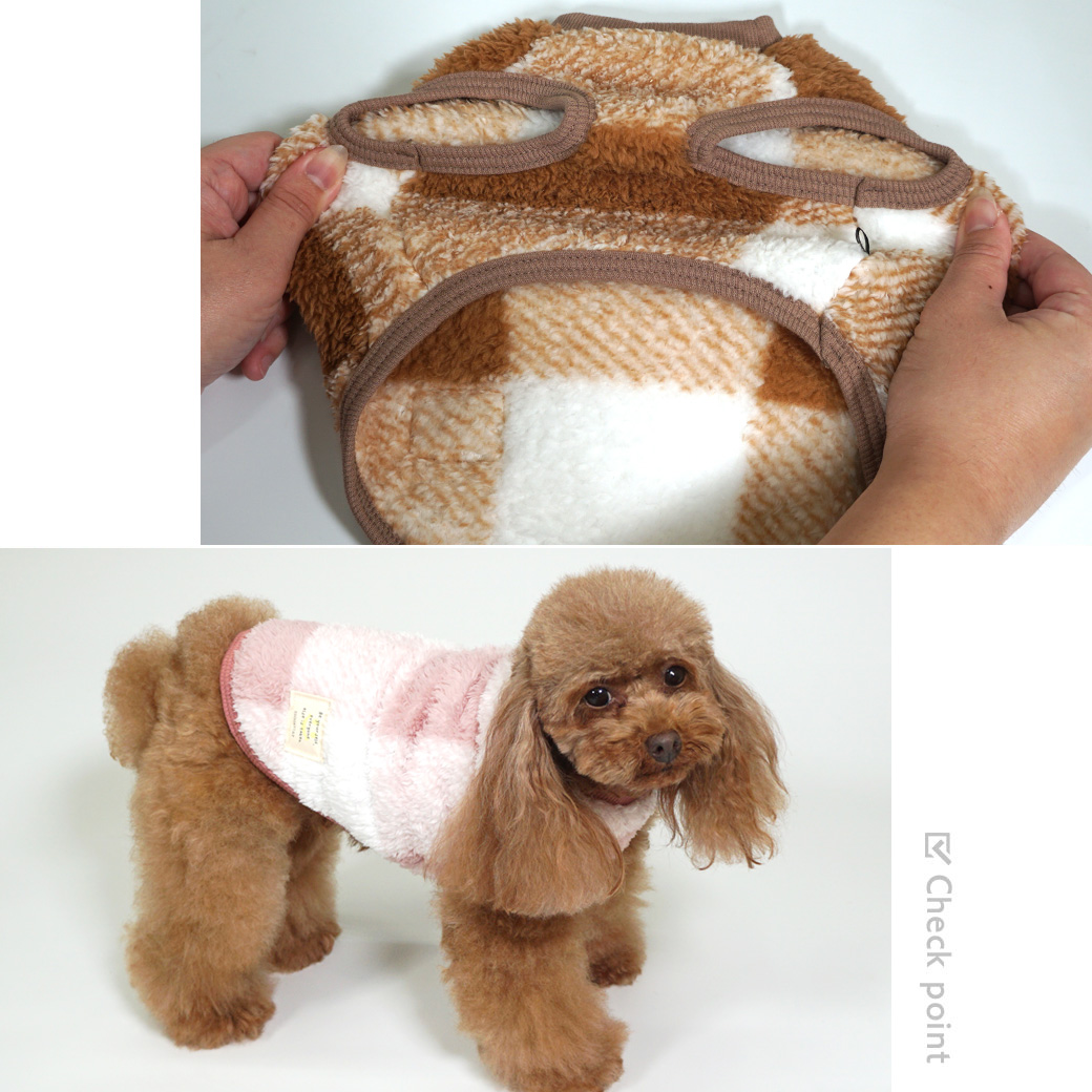 トイプードル4.5kg(首26/胴40.5/丈30cm)の里梨衣ちゃんはチェックピンクのLを着用