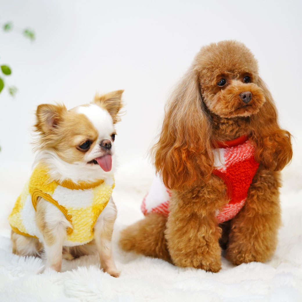 トイプー2.8kgのグミちゃんはチェックレッドのM、チワワ2.6kgのこつぶはチェックイエローのSを着用