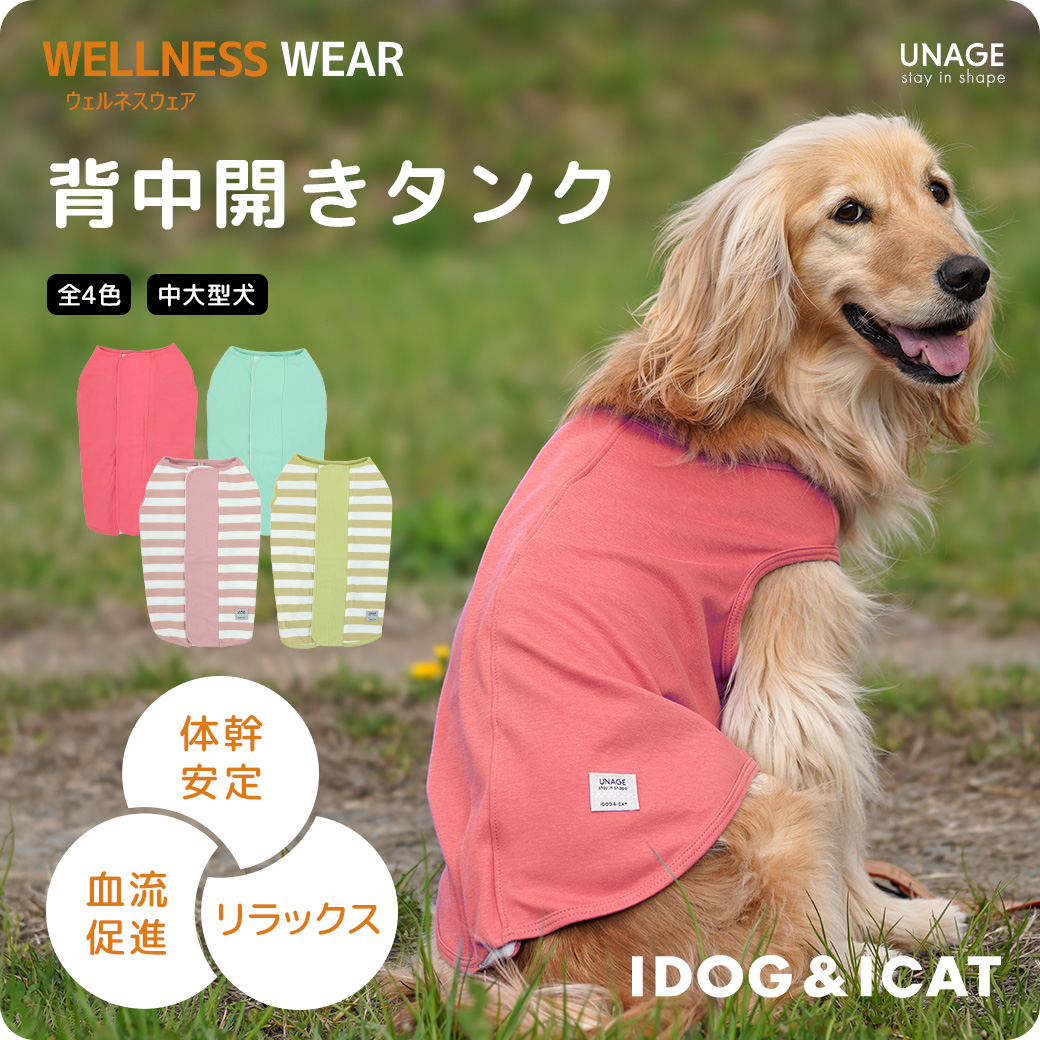 シニア期や病気のペットが快適に過ごせるように開発した新しい機能性ウェア「unage」(アンエイジ)シリーズです。「IDOGウェルネスウェア」は高機能素材を固着したドッグウェアで、着用する愛犬・愛猫にリラックス状態、血流の促進、体幹安定効果による歩行時の転倒・ふらつきを予防する目的で企画しました。