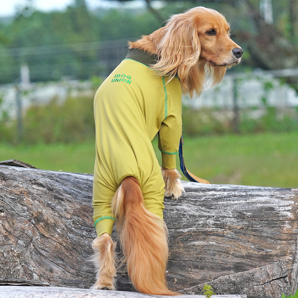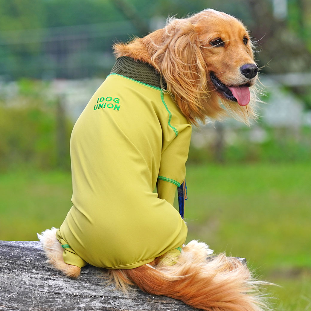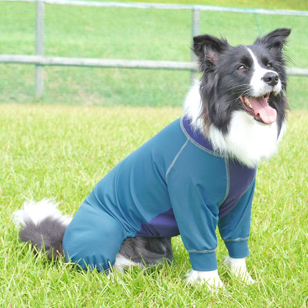 フィット感抜群の愛犬用つなぎ「ウルトラフィットドッグカバー」。 「こもりやすい」を解消するメッシュ切替の愛犬用カバーオール。