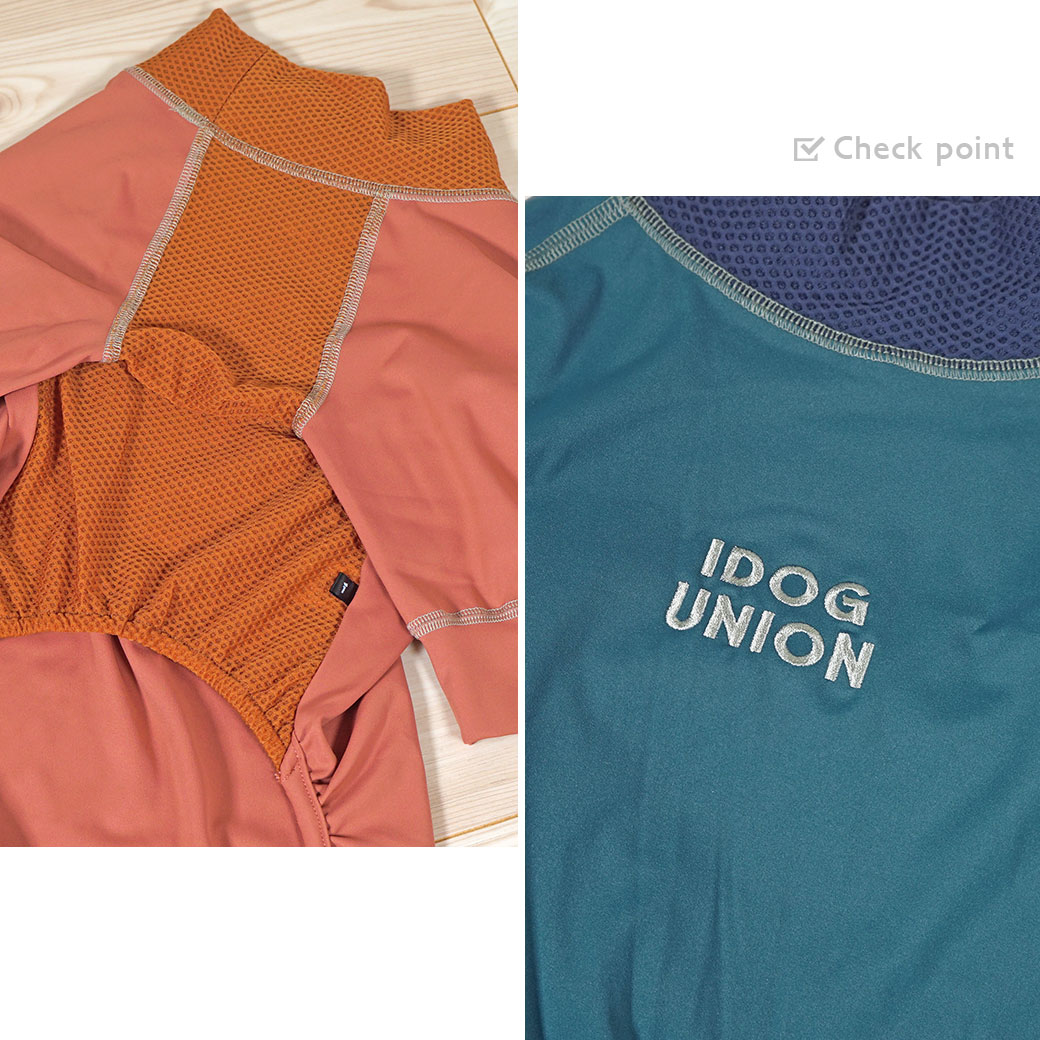 濡れやすい首元や湿気がこもりやすいお腹側を快適に保つために、メッシュ素材で切り替えました。