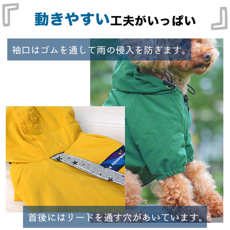 足もしっかりとカバーする袖付きタイプの愛犬用レインウェアで、袖口にはゴムを通して雨の侵入を防ぎます。 総裏タイプで裏地は軽いメッシュ素材を使用し、べたつきや布地が愛犬の被毛に張り付くのを防ぎ、快適な着心地でお散歩できます。