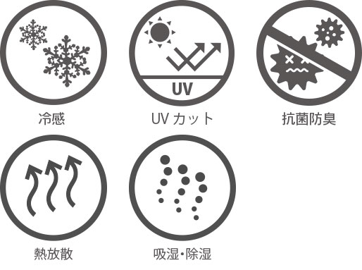 防蚊・防虫・熱放散・抗菌・吸湿・除湿・吸汗速乾・消臭・UVケア